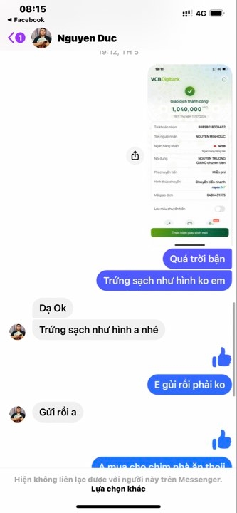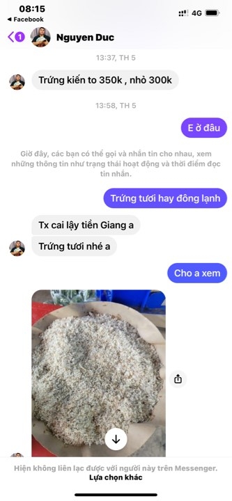 Thông tin chi tiết: Chuyển tiền mua trứng kiến 1.040.000đ rồi chặn người mua